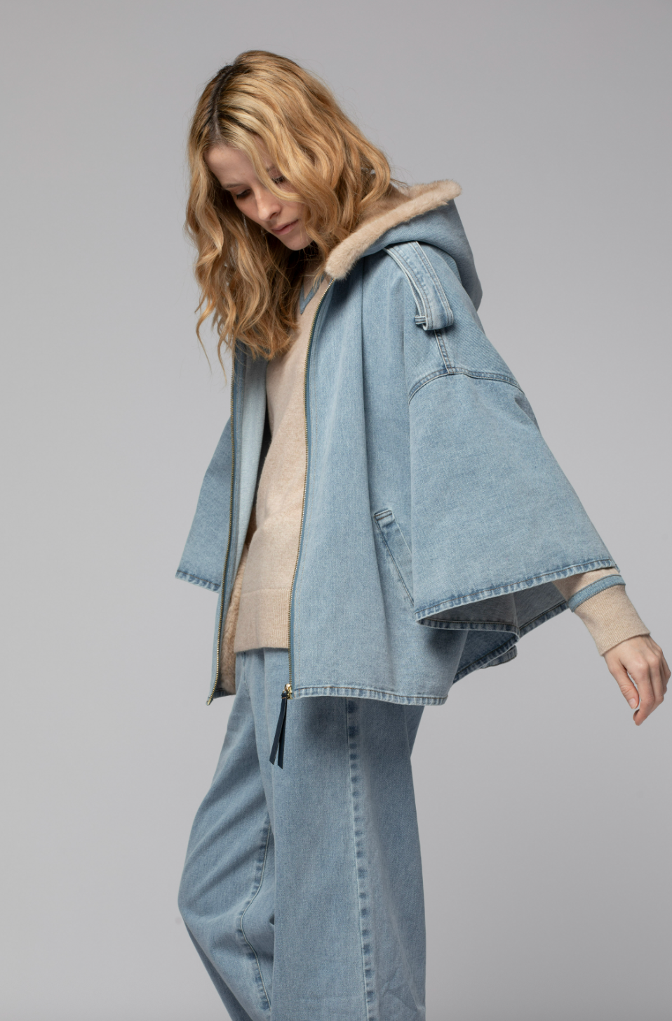 Crafted from a sumptuous wool and cashmere blend, our VANDA poncho charms with its ultra-soft brushed knit that gently wraps the body in warmth and comfort. Its loose fit and wide armholes offer optimal freedom of movement, ensuring ease throughout the day. Accented with lambskin leather details that structure the lines and elevate the shoulder flaps, this cape-style poncho exudes a modern, couture-inspired allure. It features a front zip fastening that reveals a deep V-neck and a matching inner knit panel, creating a bold layered effect. Perfect for the season, it’s topped with a generous hood to shield you from chilly winds.