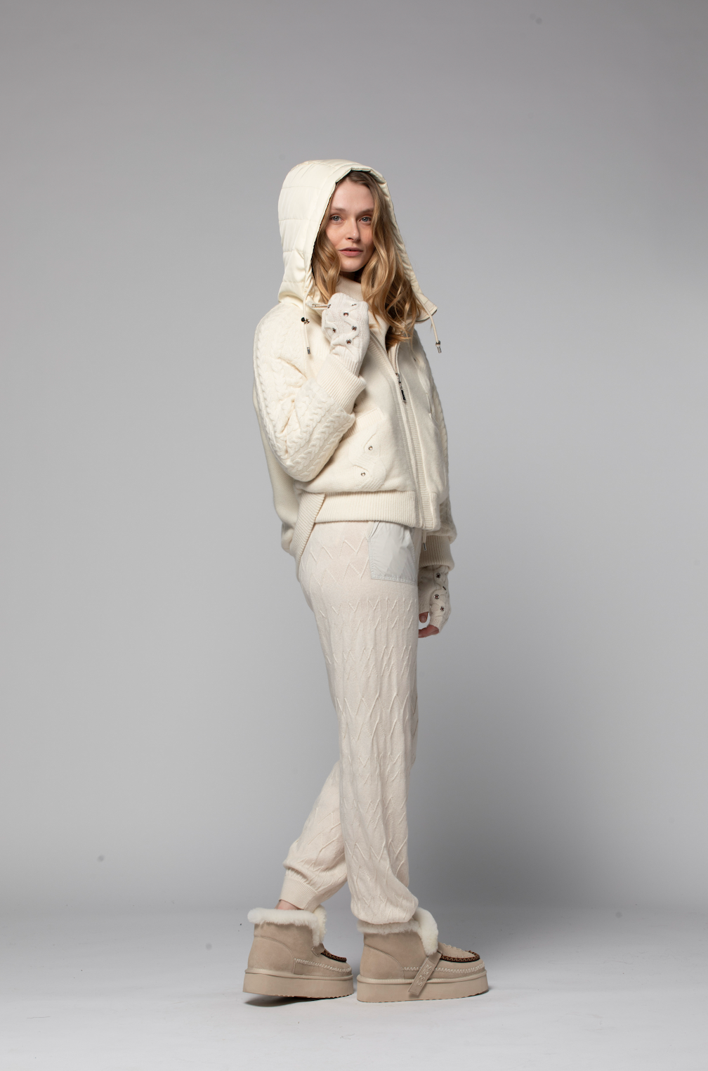 Our VAPA jacket is a true style gem. Crafted from a soft wool and cashmere blend, it features a generous silhouette structured by wide ribbed trims and softened by a rounded hem at the back. It showcases an exclusive knit: on the body, intricate cables intertwine with eyelet details for a bold, modern touch, while the long sleeves are adorned with all-over braiding. Versatile and reversible, it reveals a quilted nylon side enhanced with leather finishes, creating a look that’s distinctly urban. Perfect for the season, it comes with a hood and a slightly raised collar to shield you from the cold. It fastens with a zip and includes two pockets on each side.