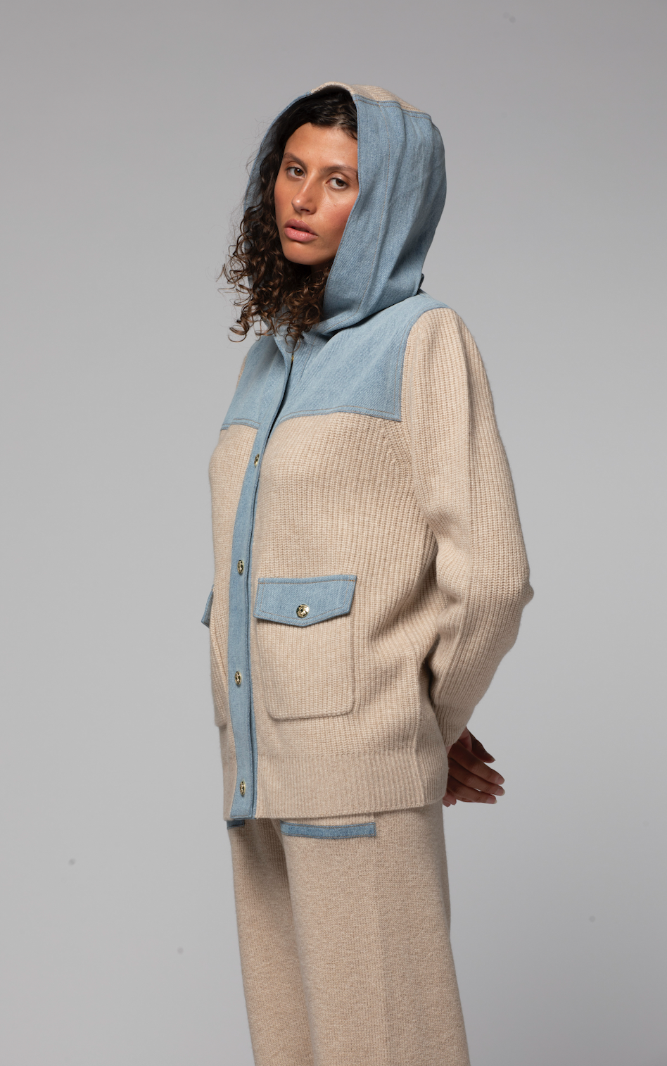 Shacket-inspired cut, contrasting details, effortless spirit — our VIXY jacket is a standout piece in the urban wardrobe. Knitted from a soft wool and cashmere blend, it features a refined English rib knit, while denim inserts modernize the silhouette and highlight its unique character. Two front flap pockets and a denim hood, accented with a matching graphic knit band, complete the look.